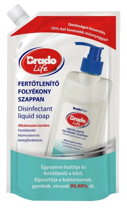 Bradolife fertőtlenítő folyékony szappan utántöltő formában, gazdaságos kiszerelésben. Egyszerre tisztítja és fertőtleníti a bőrt. Elpusztítja a baktériumok, gombák, vírusok 99,99%-át. Alkalmazható fertőtlenítő kézmosásra és betegfürdetésre.