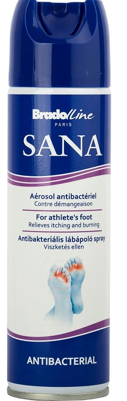SANA antibakteriális viszketés elleni lábápoló spray. Sportolók és közösségi fürdőket használók számára, lábfertőzések megelőzésére. Csökkenti a lábujjak közötti bőr viszketését és a hajlatok kipirosodását. Antibakteriális hatóanyagot, bőrregeneráló D-panthenolt, hűsítő borsmenta olajat és gyulladáscsökkentő Alfa-bisabololt tartalmaz.