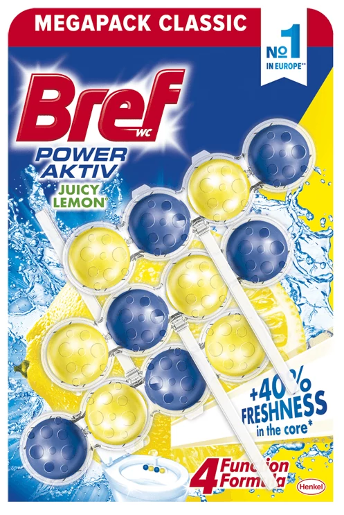 Az új Bref Power Aktiv a hosszantartó illat mellett vízkő ellen továbbfejlesztett formulát tartalmaz egy tisztább és ragyogóbb toalettért.