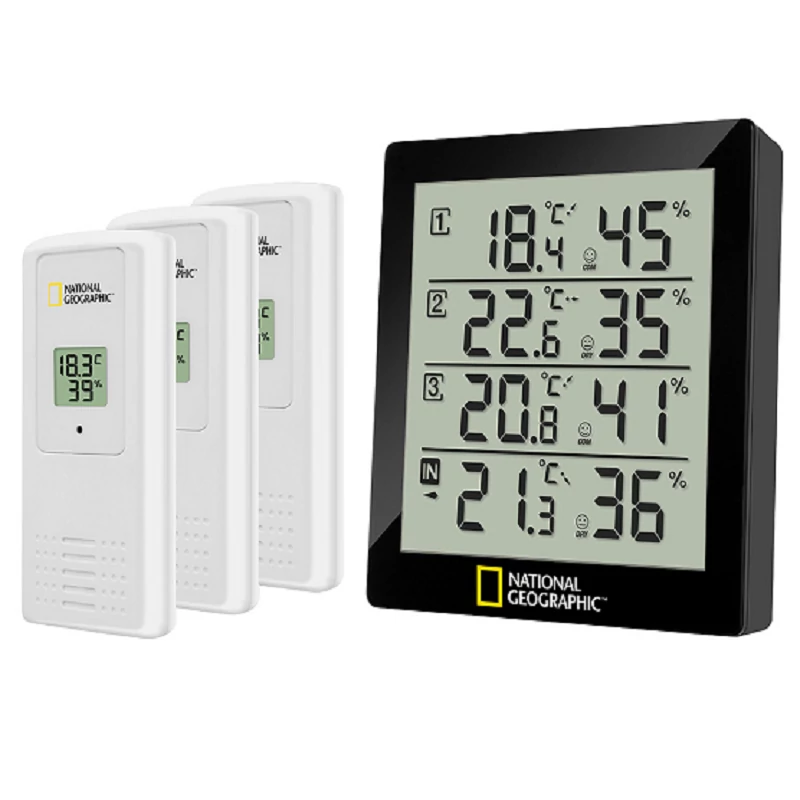 The National Geographic thermo-hygrometer offers the possibility to measure temperature and air humidity in or around your house at 4 different locations, with simple monitoring at one location: Is my cellar room too moist and threatened by mould? Is the children's bedroom temperature all well? Is it too hot on the terrace? There are many more options open.