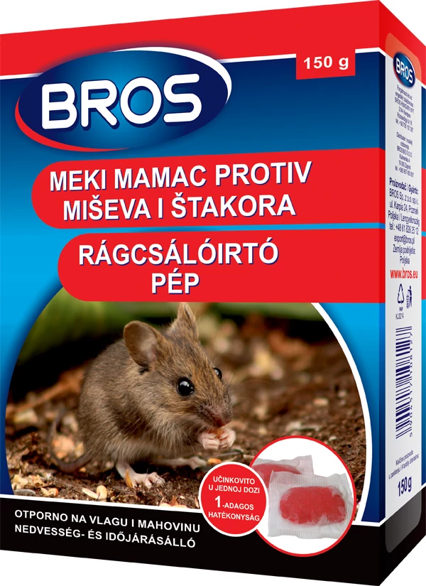 A BROS rágcsálóirtó pép, mérgezett csalétek pép formában. Vonzó hatása abban is rejlik, hogy ez a lágy, nedves massza friss élelem benyomását kelti a rágcsálóban. Előnye, hogy ellenáll a penésznek, nem válik dohossá, ellenáll a nedvességnek. Bármilyen hőmérséklet és környezeti viszonyok mellett kihelyezhető. Ajánlott hideg raktárakba, mezőgazdasági épületekbe, pincékbe is. Könnyen, egyszerűen használható. A rágcsálót mumifikálja.