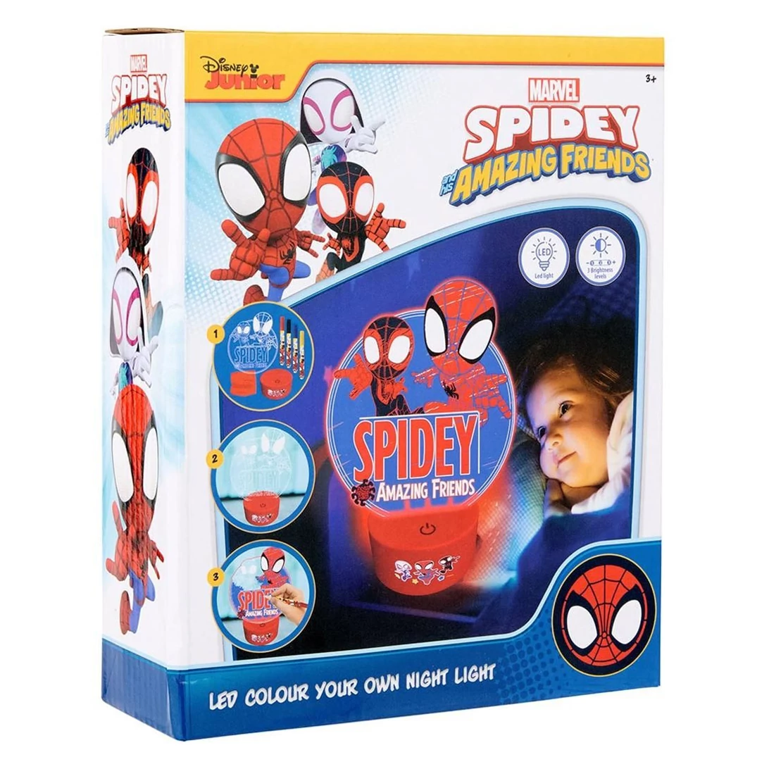 A készlet tartalmaz egy LED lámpatalpat, átlátszó, Spidey és barátai mintával díszített világító lapot, valamint 4 élénk színű filctollat, mellyel a gyerekek kedvük szerint kiszínezhetik a mintát. Miután elkészült a remekmű, a LED világítás életre kelti a rajzokat, így nemcsak szórakoztató alkotás, hanem praktikus, megnyugtató éjszakai fényforrás is válik belőle. A lámpa háromféle fényerővel rendelkezik, így a szoba hangulatához és az elalvási szokásokhoz is tökéletesen igazítható.
