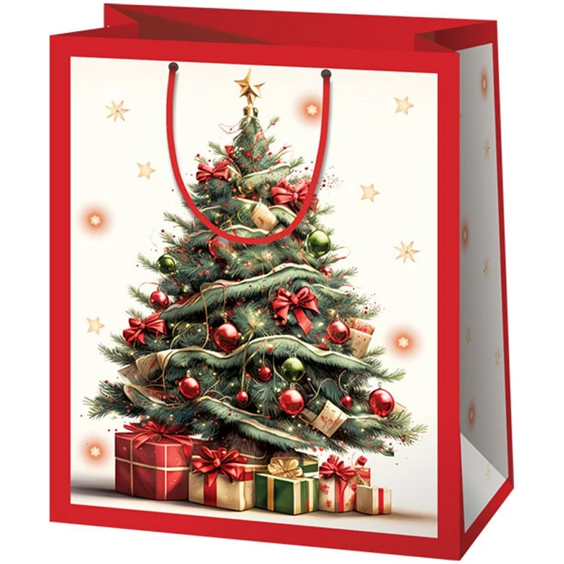 Ha igazán szeretnéd megidézni a karácsony klasszikus hangulatát, ez a közepes méretű (17x10x23 cm) Cardex ajándéktáska tökéletes választás lesz. A táska közepén egy gazdagon díszített, csillaggal koronázott karácsonyfa áll, körülötte színes ajándékdobozokkal, piros és zöld gömbökkel, szalagokkal és ünnepi masnikkal. Az élénk piros keret még hangsúlyosabbá teszi a dizájnt, így már ránézésre is öröm lesz átadni.