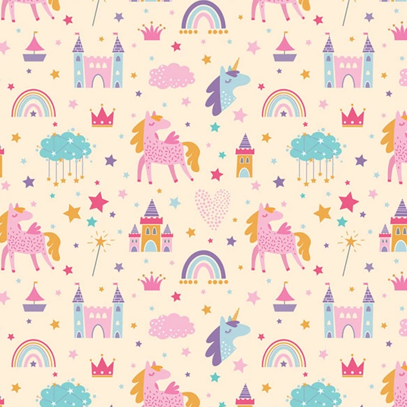 Varázsold el a kislányokat már az ajándék kibontása előtt ezzel a mesés, 100x70 cm-es Unikornisok mintás csomagolópapírral! A bájos dizánt rózsaszín, lila és pasztell árnyalatok uralják, miközben mosolygós unikornisok, hercegnői kastélyok, szivárványok, varázspálcák, felhők, koronák és csillagok töltik meg a felületet – mintha egy igazi tündérmese elevenedne meg a papíron.