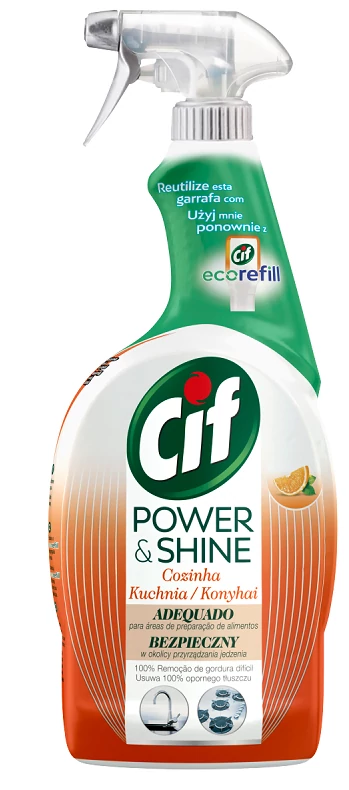Cif Cleanboost™, egy úttörő formula, ami... Természetes eredetű tisztító hatóanyagot, 100% biológiailag lebomló illatanyagot tartalmaz, és biztonságosan használható étellel érintkező felületeken is. A flakon** pedig 50% újrahasznosított műanyagot tartalmaz. A Cif Power + Shine konyhai zsíroldó spray hatékonyan eltávolítja a makacs szennyeződéseket, és ragyogóan tisztán tartja a konyhát. Erőteljes mélytisztító molekulái 100% zsíroldást* és csíkmentes ragyogást biztosítanak.