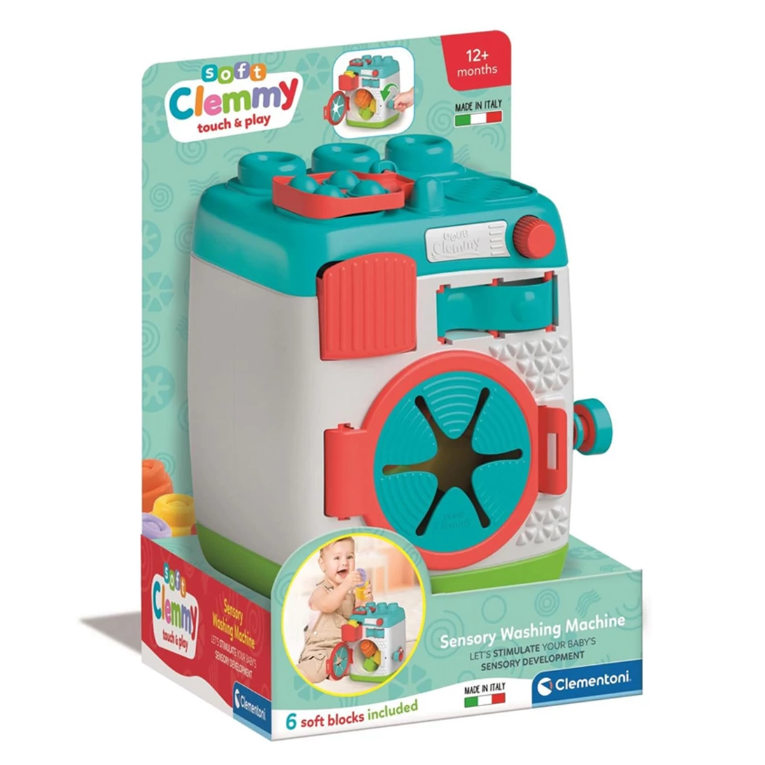 A játékhoz 6 db színes, puha Clemmy építőkocka is tartozik, amelyeket a mosógép dobjába lehet helyezni. A kicsi ezután a tekerő segítségével „elindíthatja a mosást”, a kockák pedig mozogni kezdenek a dob belsejében – ezzel játékos módon tanulja meg az ok-okozati összefüggéseket. Az ajtót ki lehet nyitni, a kockákat ki lehet pakolni, újra be lehet tenni, miközben a különféle nyitható-zárható elemek és gombok ösztönzik a felfedezést és az önálló játékot.