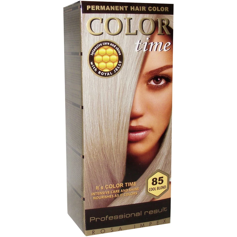 Color Time hajfesték tartós hajfesték méhpempővel. A méhpempő regenerálja, hidratálja és vitalizálja a hajat, csillogást és intenzív ápolást nyújt. A Color Time gél formula hihetetlen színállóságot biztosít. Szín pigmentek a zselével kombinálva mélyen behatolnak a haj belsejébe ezáltal garantálják az élénk színt. A Color Time egy speciális szilikon kondicionálót is tartalmaz ezáltal a haj ragyogó és puha lesz.