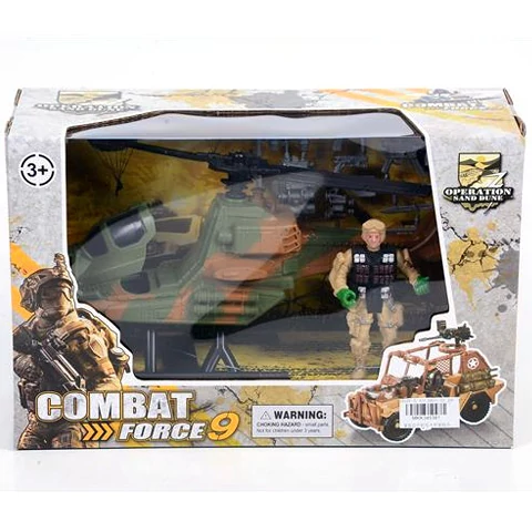 Ebben a szuper a dobozban egy katonai, felderítő helikoptert találnak azok a kisfiúk, akik szeretnek játék katonákkal komoly csatákat vívni. A rendkívül aprólékosan kidolgozott jármű igazán remek játékélményeket tartogat a gyerekek számára. A dobozban ráadásul egy akció figura is helyet kapott, ami a mozgatható kezeivel és lábaival, valamint kiegészítő felszereléseivel akár bele is ültethető a helikopter pilótafülkéjébe. A játék izgalmas bevetések és katonai akciók lejátszására ad lehetőséget.
