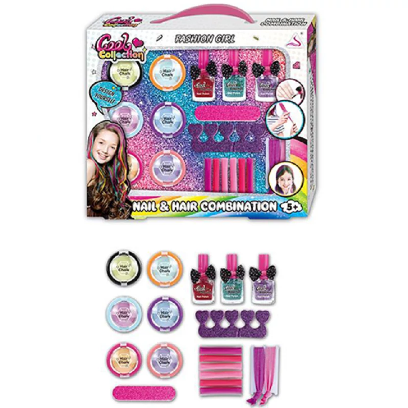 Szerezz be gyermeked számára egy Cool Collection köröm és hajdekoráló stúdiót amelyben minden olyan eszköz és alapanyag a rendelkezésére állhat, amelyekből trendi és divatos frizurát és körmöt készíthet el saját kezűleg egy szempillantás alatt. A készletben található, összesen 6db különböző színű hajkréta egyetlen mozdulattal használható, csupán végig kell húzni a hajon és máris színpompás frizurát készíthettél. A körömlakkok és a hozzájuk tartozó segédeszközök segítségével divatos és csillogó körmök készíhetők el.