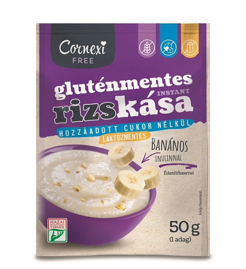 Glutén- és laktózmentes, banános rizskása hozzáadott cukor nélkül, inulinnal.