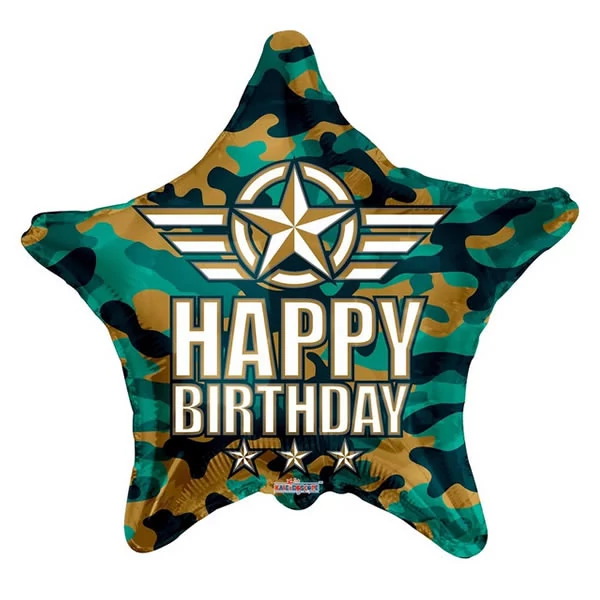Fólia lufi, 18"/45cm, csillag formájú. Happy Birthday felírattal, Army mintás.