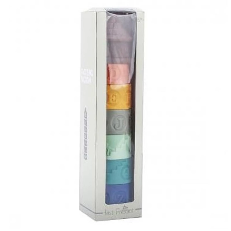 Ez a kiváló minőségű toronyépítő játék sokrétű játéklehetőséget kínál a gyermekek számára. Az alsó öt elem mindegyikén van egy-egy állatfej, így a kicsik megismerkedhetnek a zsiráffal, macival, elefánttal, koalamacival, és oroszlánnal. A kockák oldalán az ABC betűi vannak felsorolva, így szép lassan azokat is megtanulhatják. Az építőelemek csipogókkal vannak ellátva, ami a hallást stimulálja. Megfelelő sorrendben egymásra téve az elemeket egy világítótorony állítható össze, aminek legfelső emelete egy toronyszoba. A puha építőelemeket akár szájukba is vehetik a gyerekek, mert nem fog számukra sérülést okozni. A puha toronyépítő játék fejleszti az érzékszerveket, a szem-kéz koordinációt, valamint a logikus gondolkozást.