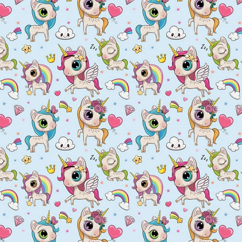 A mintázat igazán vidám és játékos: az édes kis unikornisok különböző pózokban jelennek meg, némelyik alszik, mások pedig szivárványos sörényükkel és csillogó szarvukkal tündökölnek. A halványkék háttér kiemeli a pasztellszínű elemeket, így a csomagolás egyszerre lesz látványos és harmonikus. A felhők, koronák, gyémántok és banánok még varázslatosabbá teszik az összhatást.