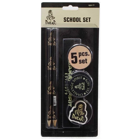 A Dakar egy évente megrendezett, sivatagi tereprali verseny ami hatalmas múltra tekint vissza, hiszen immár negyven éve volt az első futam Párizs és Dakar között. Noha a verseny azóta más kontinenseken is megrendezésre került a neve továbbra is Dakar maradt és egybeforrt az elképesztő kihívással és emberpróbáló körülményekkel. Ez a vagány írószer csomag két grafit ceruzát, egy hegyezőt, egy vonalzót és egy radírt tartalmaz, de mindegyik elegáns fekete színben és a Dakar aranyszínű emblémájával van díszítve.