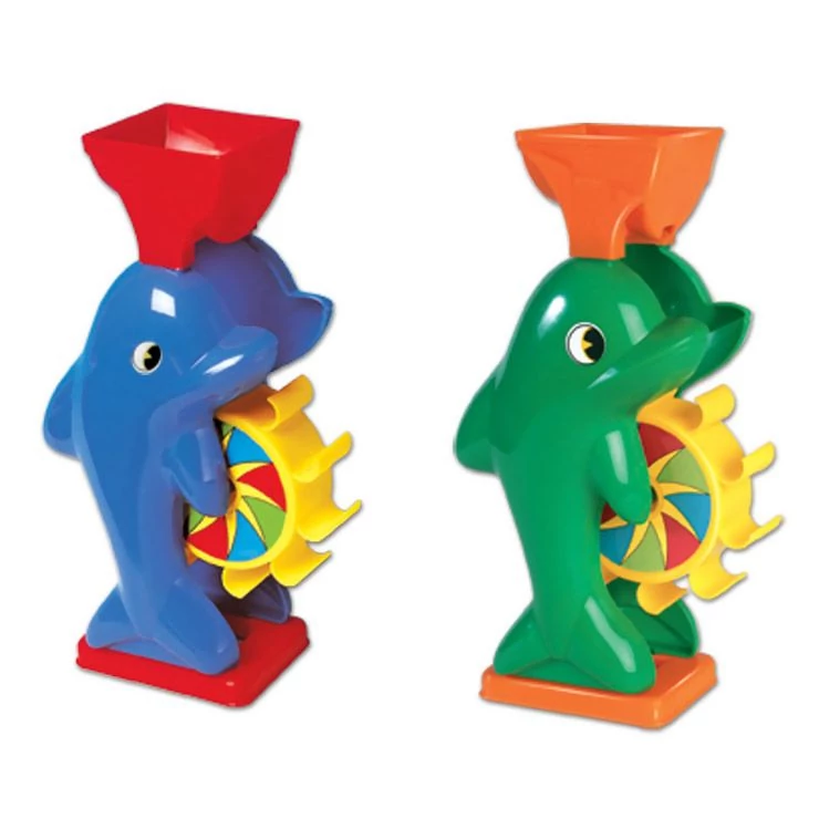Töltsd be a delfines homokmalom tetején lévő nyílásba a homokot, és a malom kerekei máris forogni kezdenek.