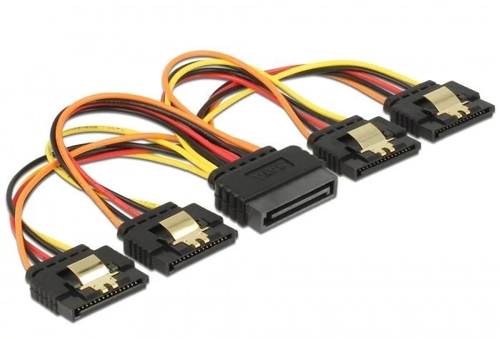 Ez a Delock kábel négy SATA eszköz energia ellátását biztosítja a tápegység egyik szabad 15 pin-es tápcsatlakozóján keresztül. A kimeneti csatlakozón lévo fém klipszek és a bemeneti csatlakozón lévő hézag biztosítja, hogy a kábel megbízhatóan kattanjon a helyére