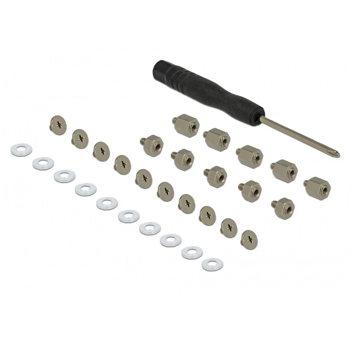 Ez a Delock szerszámkészlet használható különböző M.2 SSD-k és modulok megfelelő foglalatokhoz rögzítésére. Továbbá, a készlet egyes darabjai használhatók elveszett kiegészítők helyettesítésére.