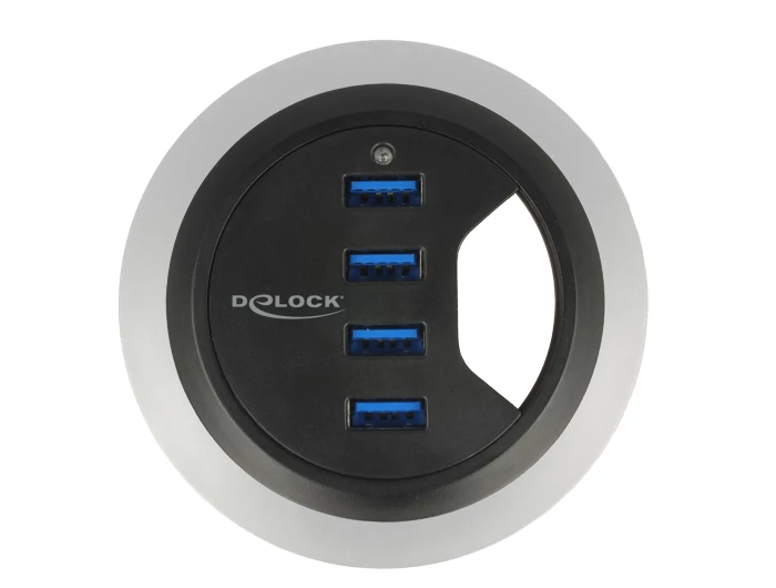 Ezt a Delock elosztót az íróasztalán lévő 60-80 mm átmérőjű kivágott részbe telepítheti, amelyen keresztül átvezetheti a monitor, a billentyűzet és az egér kábeleit. Az elosztó egyszerre négy A-típusú USB-csatlakozóhüvelyt biztosít. Az adatátvitel és a tápellátás egy A-típusú USB 3.0-s csatlakozódugón és egy A-típusú USB 2.0-s csatlakozódugón keresztül garantált. A szabad csatlakozók közötti távolság maximálisan 20 cm lehet, mivel a két kábel össze van kötve egymással.
