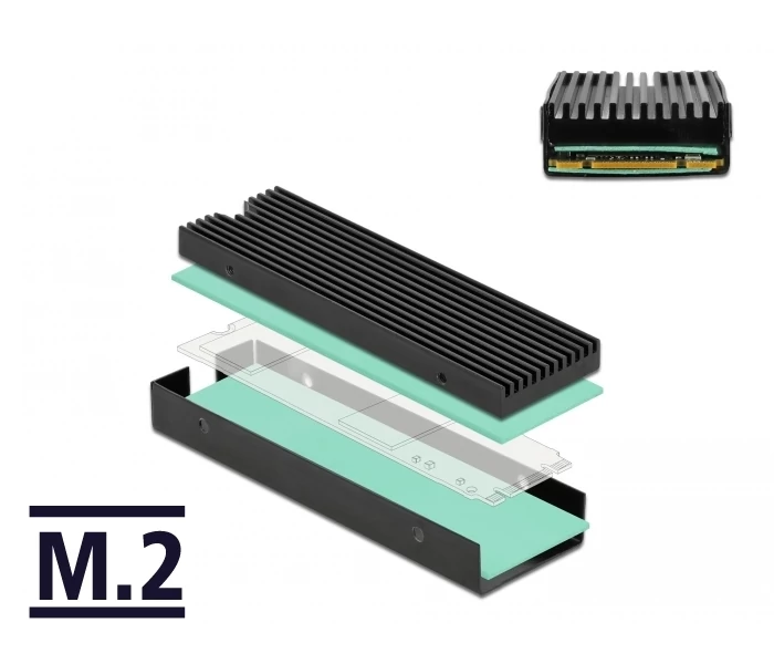 Ez a Delock hűtőborda használható egy M.2 SSD hőelosztására. Egyszerűen körbeveszi az SSD-t, és az SSD-ből kibocsátott hő átkerül a hűtőbordába a hővezető párnákon keresztül.
