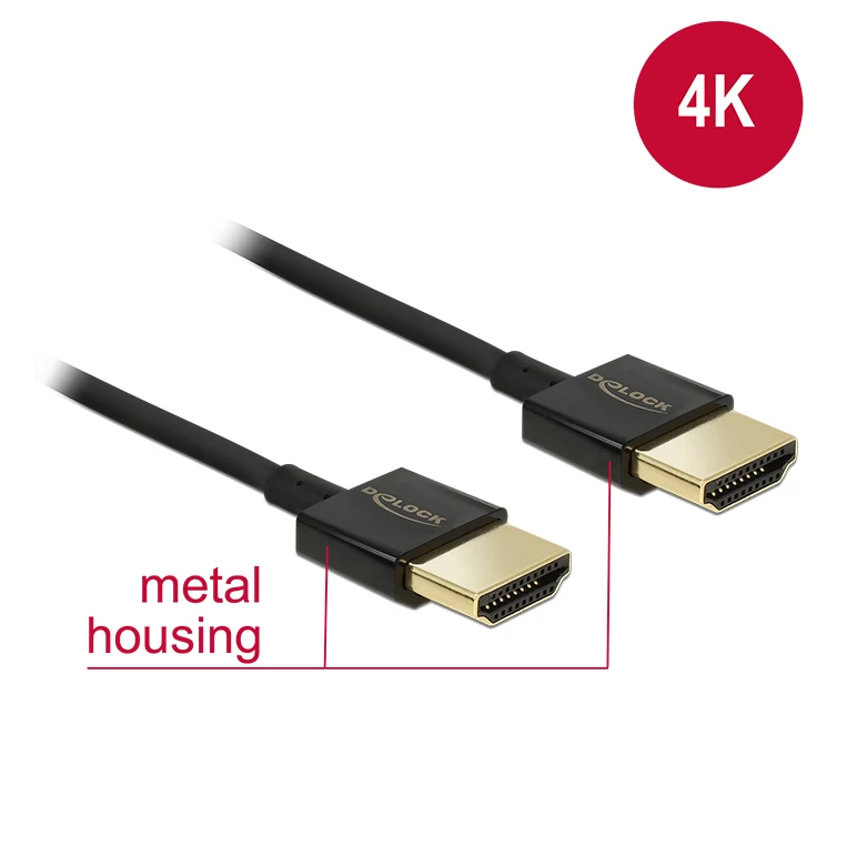 Ez a Delock gyártmányú, prémium minőségű, nagysebességű HDMI-Ethernet-kábel a vékony átmérőjének és rövid csatlakozóinak köszönhetően kiemelkedik a többi termék közül. A háromszorosan árnyékolt kábel gyors adatátvitelt, illetve hang-/video- és Ethernet-csatlakozást biztosít. A maximum 18 Gb/s sávszélességnek köszönhetően mostantól lejátszható a 4K tartalom (max. 60 Hz-es képváltási sebességgel), a 4K felbontású 3D-tartalom (max. 24 Hz-es képváltási sebességgel) és a 21:9 (mozi) képarányú tartalom. A kábel segítségével két videocsatorna egyidejűleg továbbítható, hogy két felhasználó tudjon egy képernyőn videostreameket megjeleníteni, ezenkívül akár négy hangcsatorna is egyidejűleg továbbítható. A hangátvitel minősége a max. 1536 kHz-es mintavételezési frekvenciával jelentős mértékben javult.
