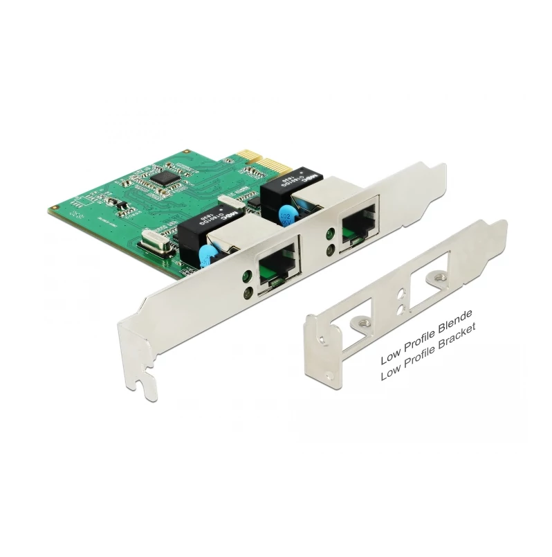 A Delock PCI Express-kártya két hálózati portot biztosít max. 1000 Mbps adatátviteli sebességgel.