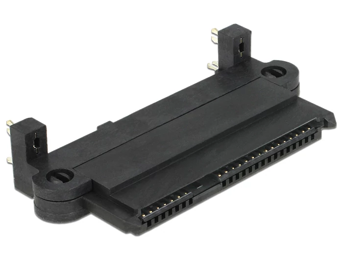 Ez a Delock csatlakozó SATA-merevlemezekhez vagy SSD-hez megfelelő. Rendszerbe integrálható, például mobil rackkel történő használhat céljából. A szabadalmaztatott NSS (= Non Scratch SATA) technológia egy integrált rugós mechanikával rendelkezik a 22 tűs oldalak egyikén, amely lehetővé teszi a merevlemez kiadását. Emiatt a merevlemezt rögzíteni kell egy keretben, máskülönben a csatlakozó rövid időn belül kiadná a merevlemezt. Az NSS technológiának köszönhetően a csatlakozó minden behelyezéskor védve van, mivel elkerüli az érintkezők karcolását. A 22 tűs csatlakozó 90 fokos szögben lesz ráforrasztva a PCB-re.