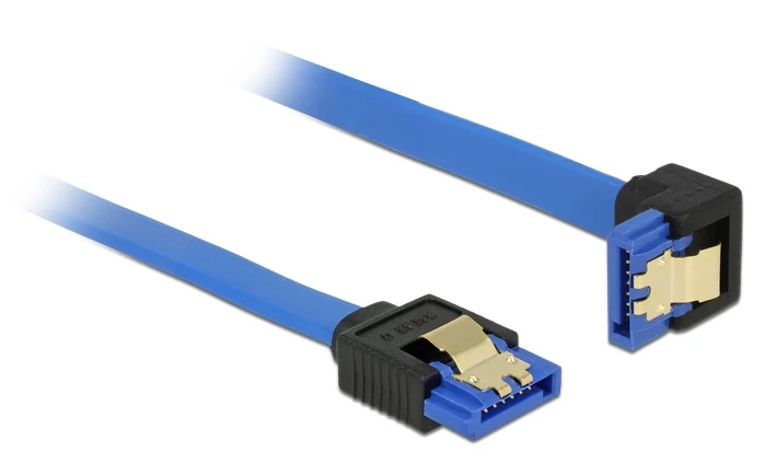 Delock SATA-kábel, 6 Gb/s, hüvely, egyenes > SATA hüvely, lefelé ívelt, 10 cm, kék aranyszínu kapcso
