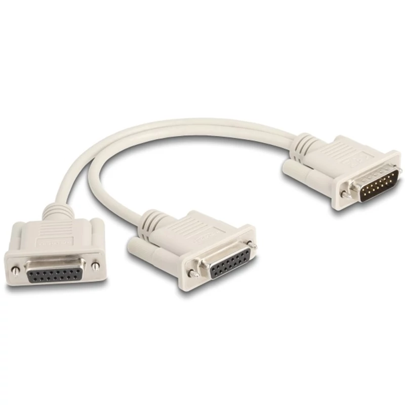 Ez a Delock osztott kábeles adapter megosztja és összeköti a D-Sub 15 apán érkező jeleket két D-Sub 15 anyára. Mind a 15 jel sáv elérhető 1:1-es adatátadásra ezzel az Y kábellel. Ez teszi az elosztót alkalmassá számítógépekhez, gépekhez, nyomtatókhoz stb.
