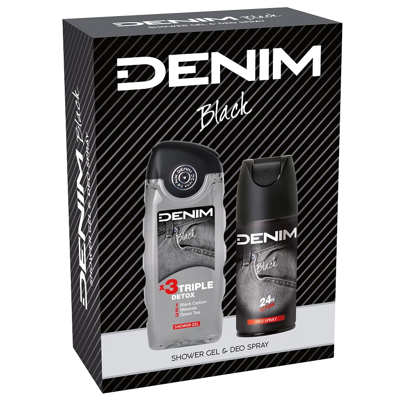 A Denim Black a fás és virágos illatok férfias elegye. A csomag tartalma egy 150 ml-es dezodor és egy 250 ml-es tusfürdő.