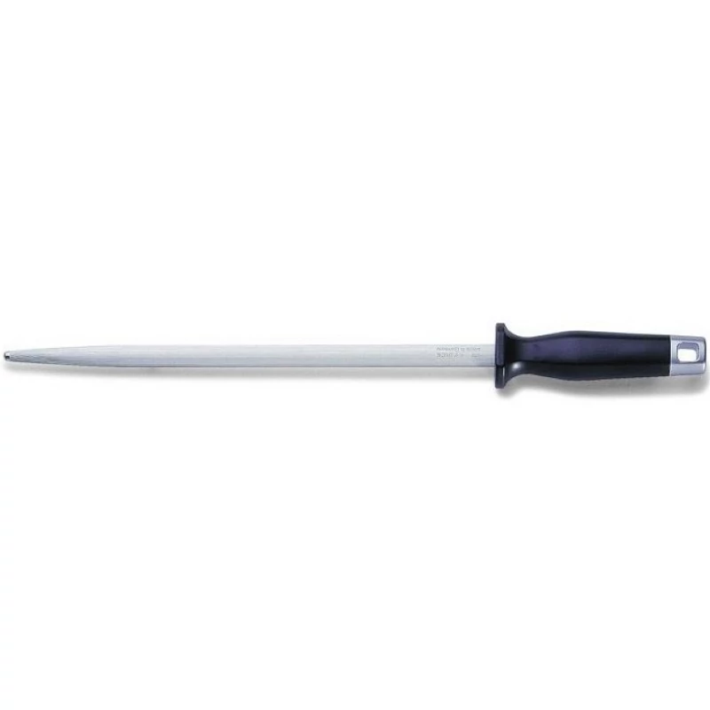 A hosszú idő óta jól bevált F. Dick élező acélpenge, ergonomikus kialakítású markolattal, ujjvédelemmel, a fogantyú végén fűzőlyukkal. Biztonságos és higiénikus, a hatályos élelmiszeripari szabályozásoknak megfelelő.