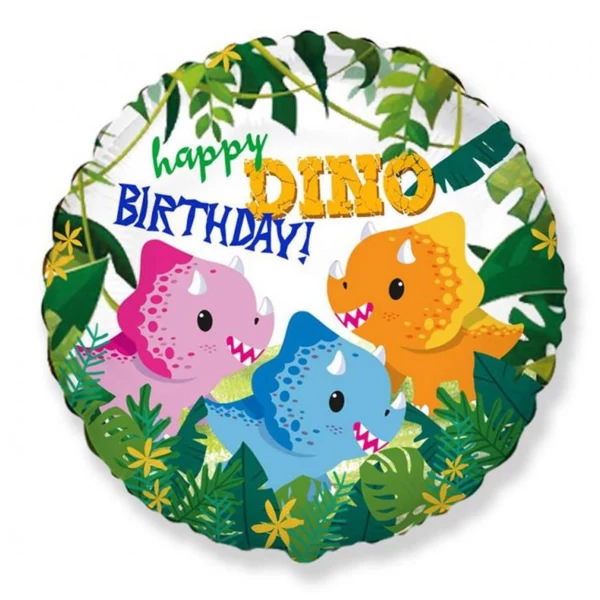 Dinó mintás, happy birthday feliratú, gömb alakú fólia lufi, átmérője 45 cm. HÉLIUMMAL FÚJHATÓ, ÖNZÁRÓ SZELEPES.