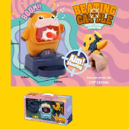 Ez a célba lövő játék garantáltan hatalmas sikert arat majd a kis srácok körében, hiszen semelyik eleme nem éppen szokványos. A fegyvert egy dinoszaurusz formájú pisztoly adja, míg a céltáblaként egy hatalmas tehén nyitott szája szolgál. A feladat egyszerű! Tedd a lövedéket a dinoszauruszos pisztolyba, kapcsold be a céltáblát, hogy a digitális kijelző helyetted számolja a találatokat, és a lehető legtöbbször találd el a célt. Mint minden célba lövő játék, úgy ez is remekül fejleszti a gyerekek szem-kéz koordinációját, ráadásul nagyszerű szórakozás is.