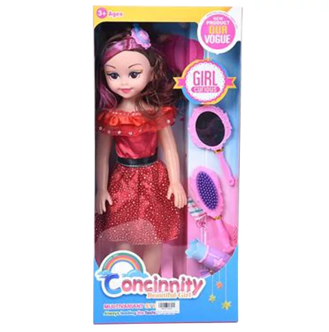 Divatbaba piros színű ruhában fésűvel és hang effektekkel 46cm