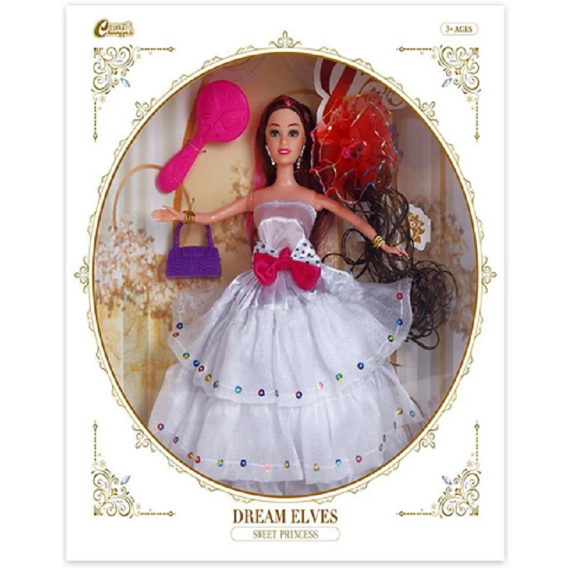 Divatbaba póthajjal és kiegészítőkkel fehér ruhában 30cm