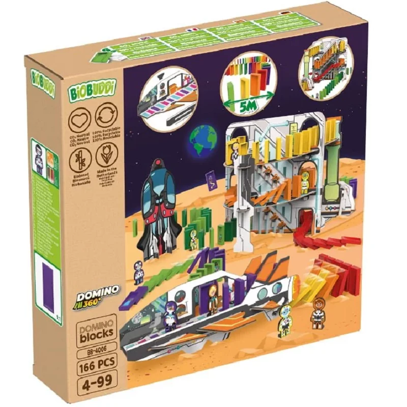 A BiOBUDDi egyedi dominókészleteket fejlesztett ki 4 éves és annál idősebb gyermekek számára. Ez a készlet a „Dominó űr”. A gyerekek először kartondobozból űrközpontot építenek, majd elkezdik elhelyezni a dominókat, és egy egyedi pályát építenek mindenféle klassz kihívással. Őrülten klassz saját dominó űrpályát építeni. A gyerekek néhány dominót le is ragaszthatnak menő matricákkal.