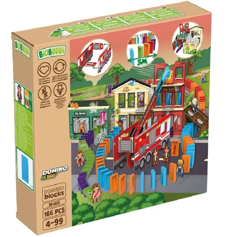 A BiOBUDDi egyedi dominókészleteket fejlesztett ki 4 éves és annál idősebb gyermekek számára. Ez a készlet a „Dominó város”. A gyerekek először megépítenek egy nagy és gyönyörű várost kartonból, majd elkezdik elhelyezni a dominókat, és egy egyedi pályát építenek mindenféle klassz kihívással a városon át. Őrülten klassz saját dominó városi pályát építeni. A gyerekek néhány dominót le is ragaszthatnak menő matricákkal.