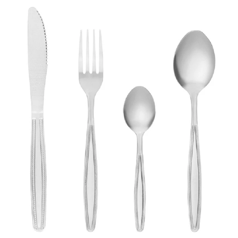 Domotti London 24 részes rozsdamentes acél készlet tartalma: 6 x 19,5 cm-es evőkanál, 6 x 19,5 cm-es asztali villa, 6 x asztali kés 20,5 cm, 6 x teáskanál 14,5 cm