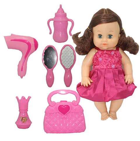 Dorina barna hajú 36cm-es pisilő baba fodrász készlettel, kiegészítőkkel és hang effektekkel