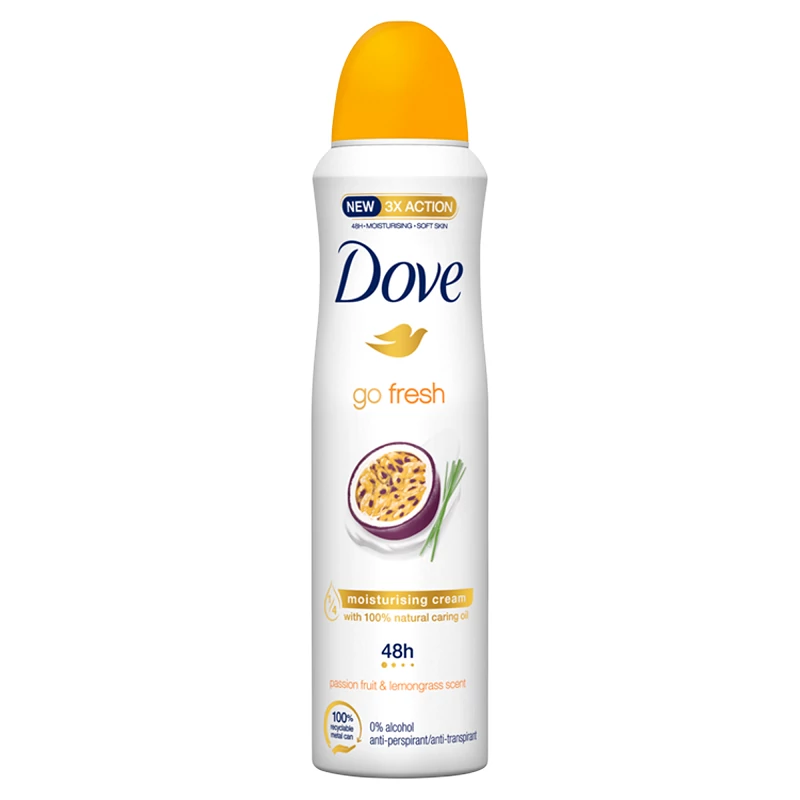 Dove dezodor és izzadásgátló a Go Fresh spray-ben a maracuja és citromfű gyümölcsös illatával akár 48 órás védelmet nyújt az izzadás és a kellemetlen testszag ellen. 100%-ban természetes olaj alapú hidratáló krémmel dúsított, amely hidratálja és puhává varázsolja a bőrt. A tartós frissességért - Dove Go Fresh!