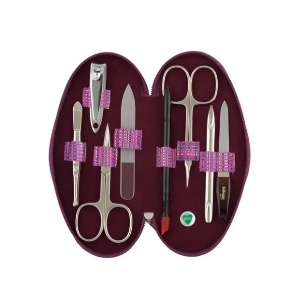 Mutatós, elsősorban nők számára összeállított 8 részes manikűrkészlet cipzáras, rózsaszín mintás bőrtokban, bordó bársonybéléssel; DUP és solingeni eszközökkel. Tartalma: hajlított solingeni körömvágóolló (9 cm), hajlított solingeni bőrvágóolló (9 cm), ferde szemöldökcsipesz,körömreszelő (9,5 cm), üveg körömreszelő (9 cm), kicsi körömcsipesz (5,5 cm), bőrfeltolólapát kaparóval, körömradír körömtisztítóval. Mérete: 16 cm x 8 cm x 2 cm.