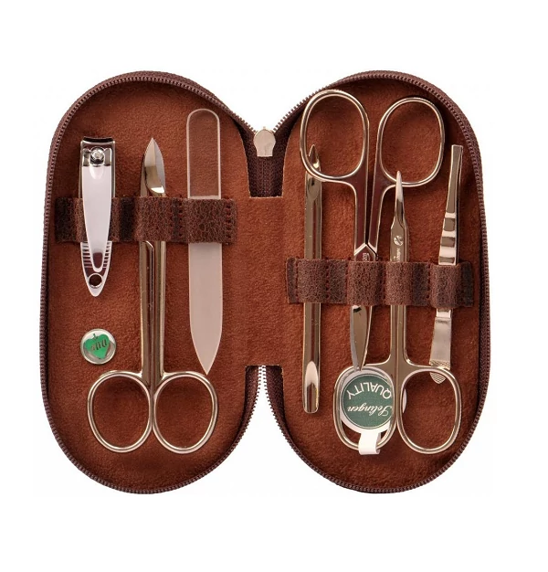 Nők és férfiak számára egyaránt ideális 7 részes manikűrkészlet cipzáras, barna bőrtokban; DUP és solingeni eszközökkel. Tartalma: solingeni hajlított körömvágóolló (9 cm), solingeni hajlított bőrvágóolló (9 cm), DUP erősített körömvágóolló, kicsi körömcsipesz (5,5 cm), egyenes szemöldökcsipesz, üveg körömreszelő (8,5 cm), bőrfeltolólapát kaparóval. Mérete: 14 cm x 7,5 cm x 2 cm.