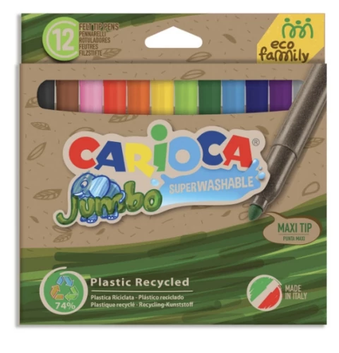 A Carioca Jumbo filctollak vastag hegyüknek köszönhetően tökéletesen alkalmasak nagyobb felületek színezésére is. A kimosható technológiának köszönhetően a filcek kisebb gyermekek számára is biztonságosan használhatók és a nem kívánt foltok minden anyagról könnyedén eltávolíthatók. A Carioca EcoFamily termékcsalád minden tagja a környezettudatosság jegyében nagyrészt újrahasznosított műanyagból készül. Az írószerek burkolatának 74%-a tartalmaz újrahasznosított műanyagot, mely íj módon óvja meg a környezeti értékeket és segít a gyerekeket is a környezettudatos életre nevelni.