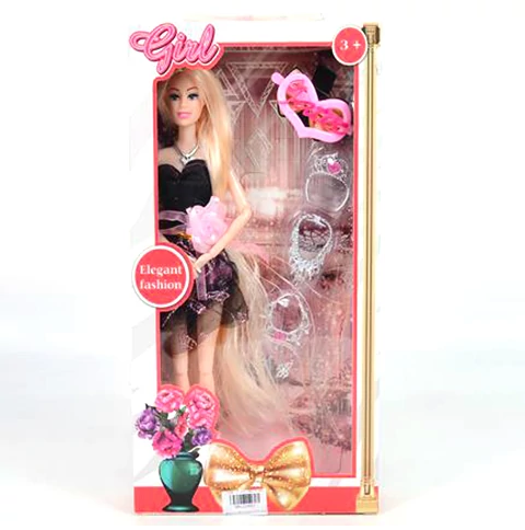 Elegáns hosszú szőkehajú 28cm-es divatbaba fekete ruhában kiegészítőkkel