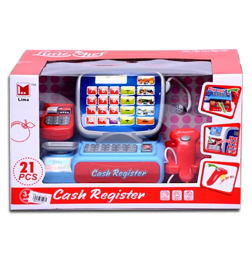 Színes kis pénztárgépeddel te lehetsz a szupermarket főnöke! Az elektronikus pénztárgép kijelzővel és benyomható gombokkal rendelkezik, mely így úgy használható mint egy igazi számológép. A pénztárgép kinyíló kasszájában megfelelő helye lesz a pénzérméknek és a bankjegyeknek, melyeket a vásárlóktól vehetsz el. A pénztárgép vonalkód-leolvasóval és mérleggel is rendelkezik, így valóban átélhetik a gyerekek a vásárlás folyamatát.