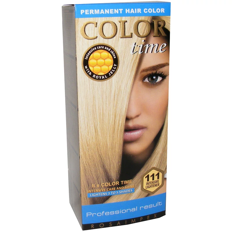 Color Time hajfesték tartós hajfesték méhpempővel. A méhpempő regenerálja, hidratálja és vitalizálja a hajat, csillogást és intenzív ápolást nyújt. A Color Time gél formula hihetetlen színállóságot biztosít. Szín pigmentek a zselével kombinálva mélyen behatolnak a haj belsejébe ezáltal garantálják az élénk színt. A Color Time egy speciális szilikon kondicionálót is tartalmaz ezáltal a haj ragyogó és puha lesz.