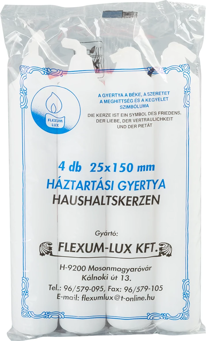 Jó minőségű, Magyarországon gyártott, tiszta paraffin, háztartási gyertya.