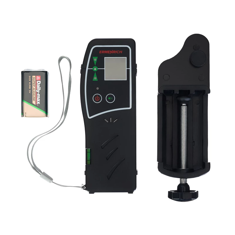Az Ermenrich LR30 lézeres vevőegység segít rossz látási körülmények között vagy nagy távolságból meghatározni a lézersugár egy vízszintes felülettől vagy mérőműszertől számított helyzetét. A vevőegység a piros és a zöld sugarakat ismeri fel. A LED-jelzőfények segítenek a készülék megfelelő felállításában, hogy a lézersugár pontosan eltalálja az érzékelőt.