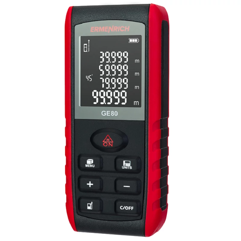 Az Ermenrich Reel GE80 lézeres mérő egy sokoldalú mérőeszköz, amely számos mérnöki, építőipari, javítási és háztartási feladathoz lehet hasznos. Nemcsak a távolság mérését, hanem a térfogat, a terület és a szögek kiszámítását is lehetővé teszi. A Pitagorasz-tétel funkció olyan esetekre került bele, ha a távolságot nem lehet egyenes vonalban megmérni (például ha a lézersugár útjában akadályok vannak). Ilyenkor a készülék számításokat végez a köztes mérések alapján.