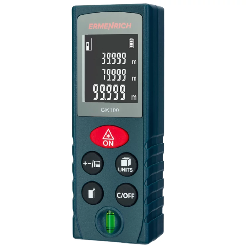 Az Ermenrich Reel GK100 lézeres mérő a legtöbb építési, javítási és különböző háztartási feladathoz szükséges funkciók széles körével rendelkezik. Segítségével távolságokat, területet és térfogatot tud mérni. A Pitagorasz-tétel funkció segít, ha a szokásos módon nem lehetséges mérést végezni: Két köztes mérés elvégzésével megkapja a kívánt pont távolságát. Beépített vízmérték.