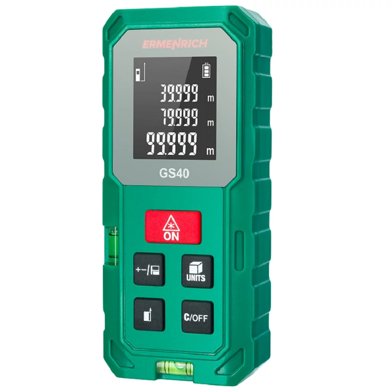 Az Ermenrich Reel GS40 lézeres mérő egy sokoldalú eszköz javításokhoz és az építőipar számára, egyszerű kezelőszervei és egy sor hasznos funkció révén pedig kompakt és praktikus. A készülék lehetővé teszi a távolság pontos mérését, még olyan nehéz körülmények között is, amikor a lézert nem lehet egyenes vonalban a kívánt pontra irányítani. Az ilyen mérésekhez a Pitagorasz-tétel funkciót használja, amely lehetővé teszi a távolság kiszámítását közvetett mérésekkel.